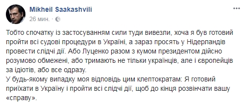 Сам Саакашвили в свою очередь на своей странице в Facebook 24 февраля заявил: "В любом случае .... я готов приехать в Украину и пройти все следственные действия, чтобы до конца развенчать "дело".