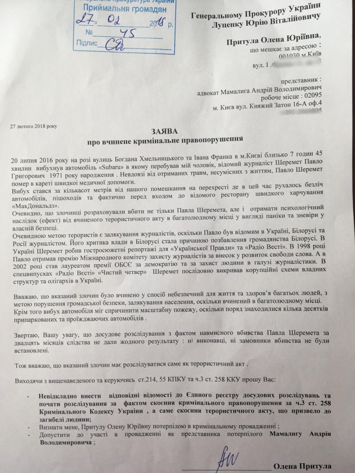 Заявление к Луценко: Убийство Шеремета должно расследоваться как теракт