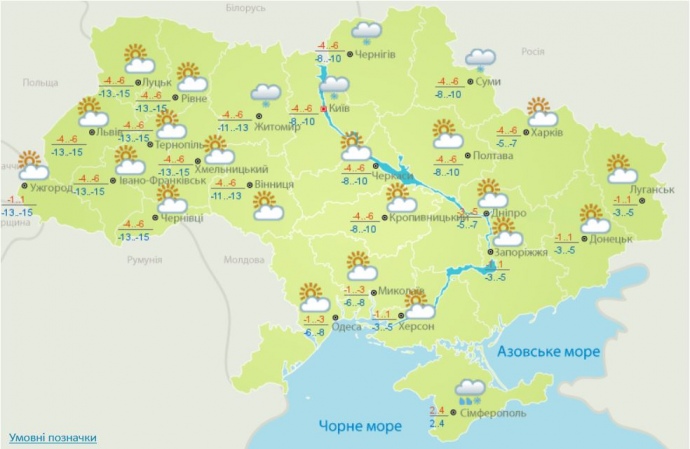 Температура ночью 8-15°, днем 0-7° мороза; в Закарпатской, Донецкой и большинстве центральных областей ночью 2-8° мороза, днем от 3° мороза до 2° тепла, в южных областях ночью от 4° мороза до 1° тепла, днем 0-5° тепла.