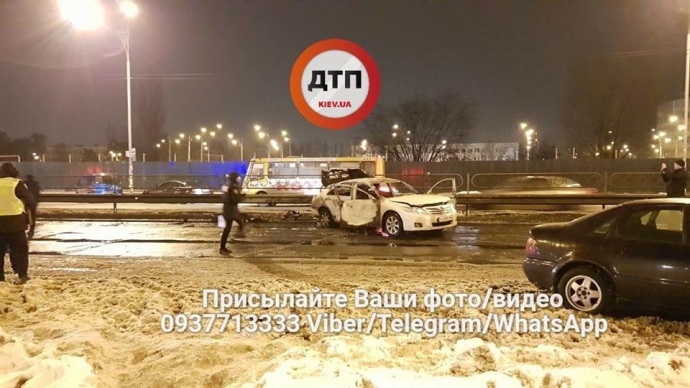 Как сообщалось, в Киеве на Броварском проспекте возле станции метро "Лесная" произошли взрывы, от которых загорелся автомобиль.