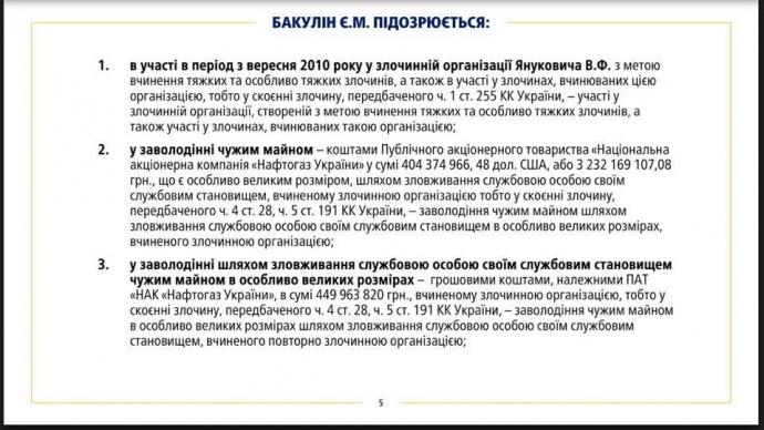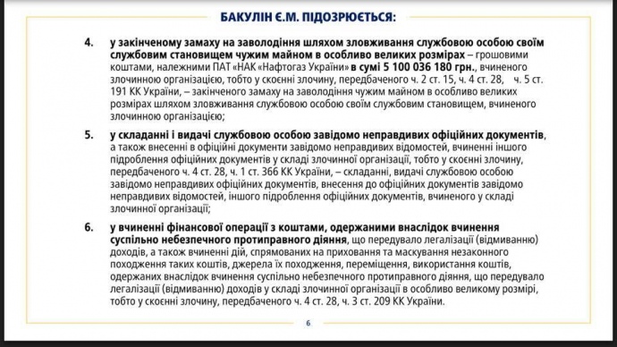 "А именно: незаконное завладение средствами ПАО "Нафтогаз Украины" в сумме 449 миллионов 963 тысячи гривен, закончено покушение на завладение средствами этого ПАО в сумме 5 миллиардов 100 миллионов 36 тысяч гривен.