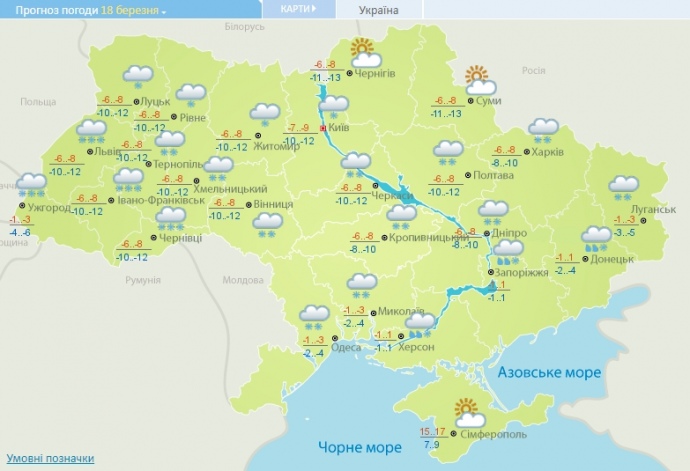 19 марта - снегопады, метели, на дорогах гололедица. В Винницкой, Черкасской, Кировоградской, Полтавской, Днепропетровской, Харьковской, Одесской, Николаевской областях - сильный снег, снежные заносы.