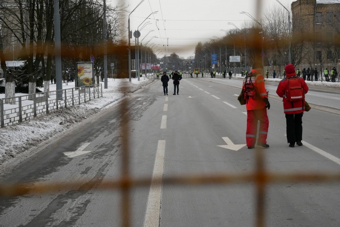С самого утра полиция и Нацгвардия перекрыла металлическими решеткам проезд на участке Воздухофлотского проспекта до посольства.
