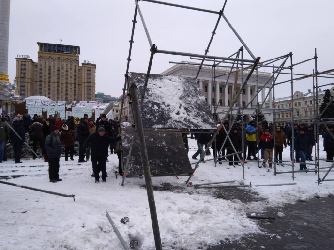 В центре Киева участники акции "Руха новых сил" начали разбирать конструкции с инсталляцией о Крыме, установленные возле Стеллы Независимости.