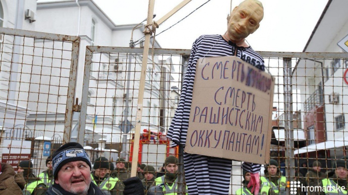 В руках они держали флаги своих организаций, флаг Украины, а также несколько плакатов с лозунгами и требованиями. Одним из главных требований протестующих является полный разрыв дипотношений между Украиной и РФ.