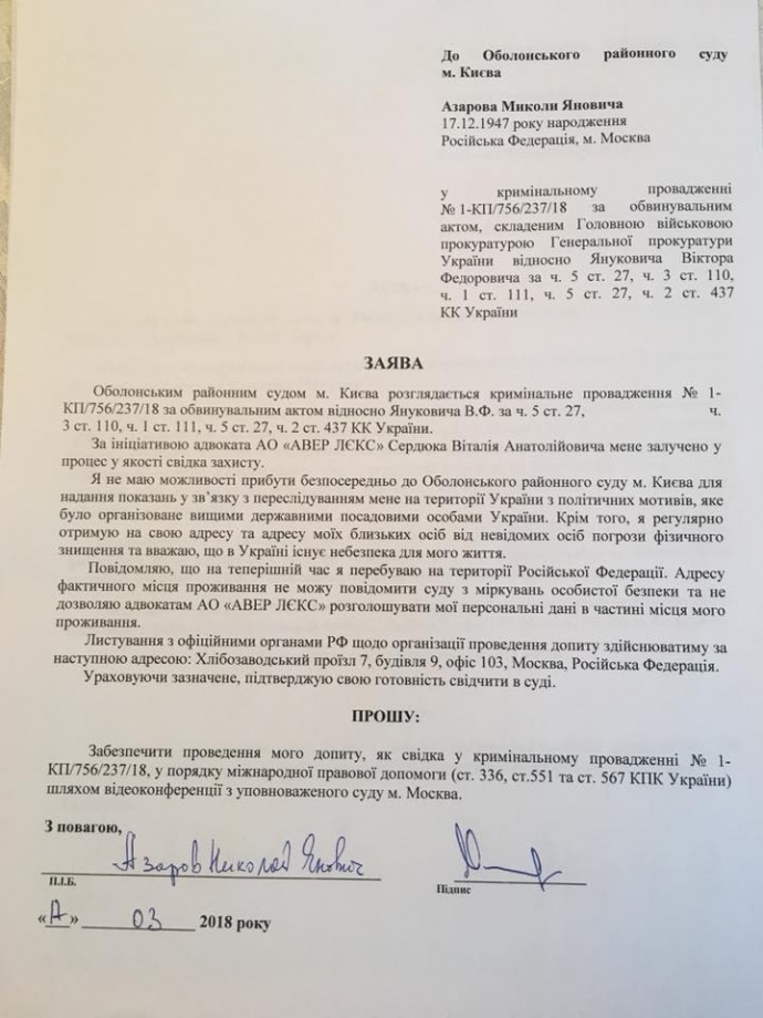 "Прошу: обеспечить проведение моего допроса в качестве свидетеля в уголовном производстве №1 КП/756/237/18 в порядке международной правовой помощи путем видеоконференции из уполномоченного суда г. Москва", - говорится в заявлении.