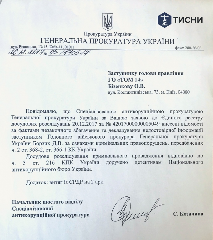 Уголовное дело возбуждено по заявлению юристов проекта "Тисни" (Bihus.Info).