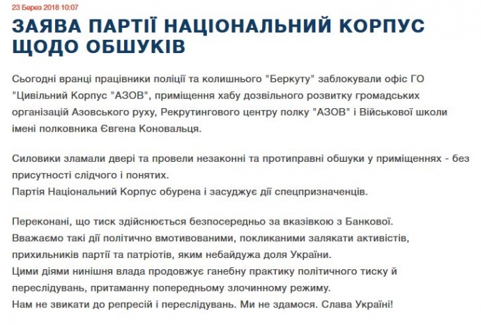 "Убеждены, что давление осуществляется непосредственно по указанию с Банковой. Считаем такие действия политически мотивированными, призванными запугать активистов, сторонников партии и патриотов, которым небезразлична судьба Украины", – заявил "Национальный корпус".