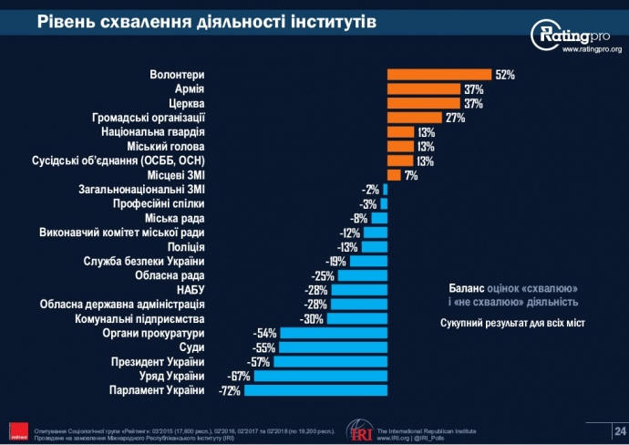 При этом украинцы поддерживают то, что делают волонтеры (52%), армия и церковь (по 37%) и общественные организации (27%).