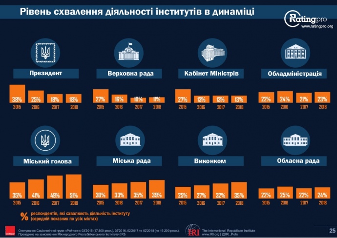 Уровень поддержки деятельности президента по сравнению с 2015 годом снизился с 38% до 18%, уровень поддержки работы ВР – с 27% до 11%.