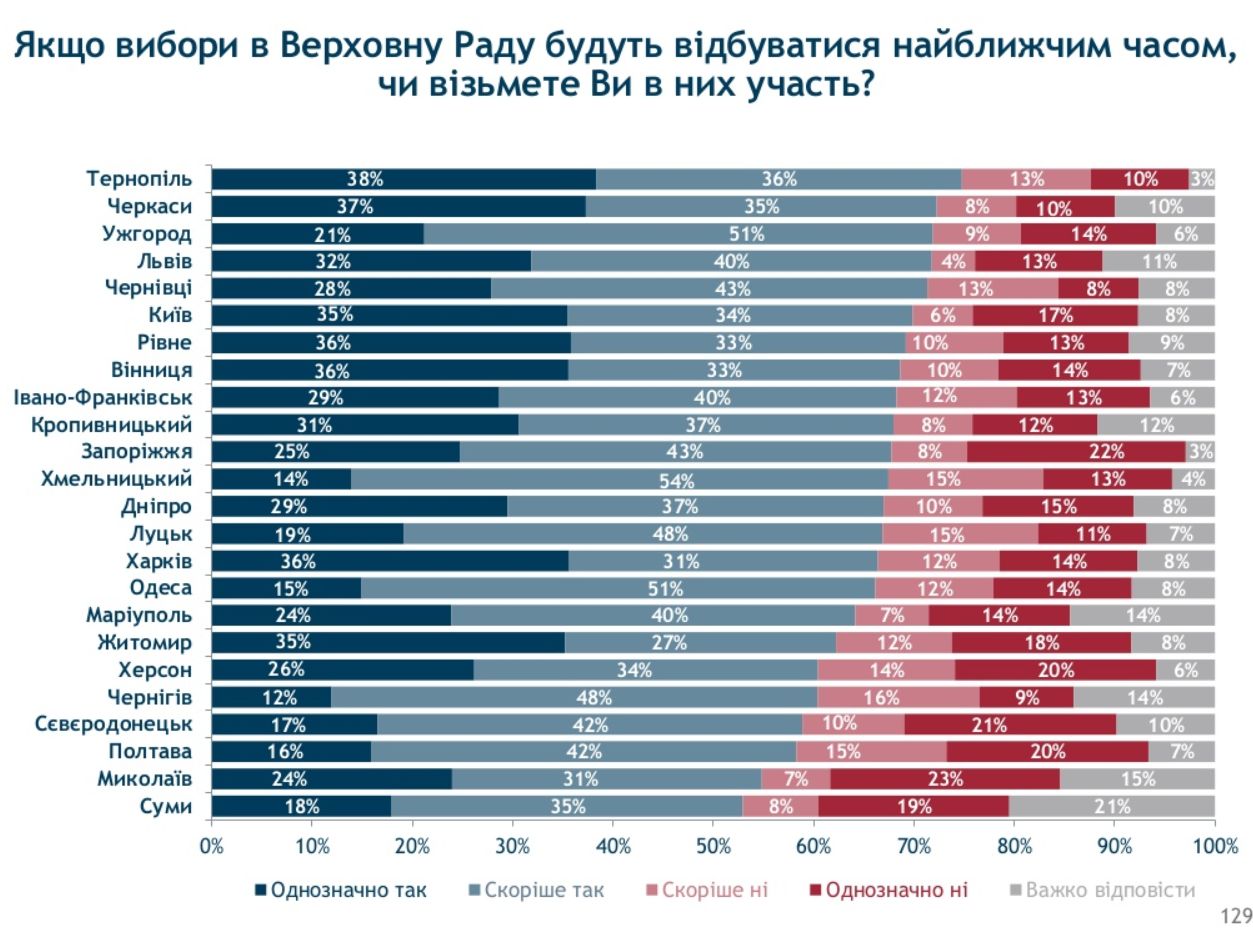 При этом больше всего жителей не планируют участвовать в голосовании в Северодонецке (30%), в Запорожье (27%), Николаеве (26%), в Сумах (23%) и в Житомире (22%).