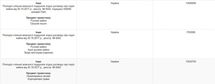 В гривнах уплата Екатерине Гориной по соглашению о разделе совместной собственности супругов от 5 октября 2017 года составила 13 400 000.