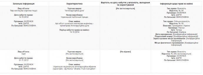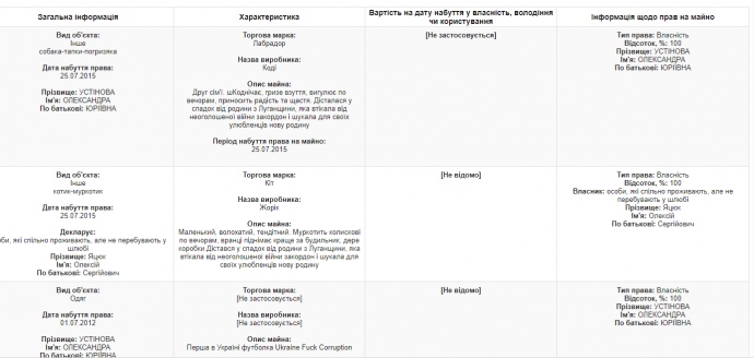 Кроме того, среди ценностей, задекларированных антикоррупционерами: инсталляции с уличных акций ЦПК, смирительная рубашка и футболка с надписью "Fuck Corruption", протестные плакаты, книги с автографами и старопечатные книги, "Кобзарь" и Конституция Украины. А также лабрадор и два кота.