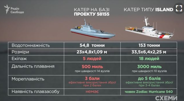 Ранее в расследовании программы "Схемы" отмечалось, что США готовы передать украинским ВМС 30-метровые катера класса "Island", которые были на службе Береговой охраны США, а сейчас стоят в порту Балтимора.