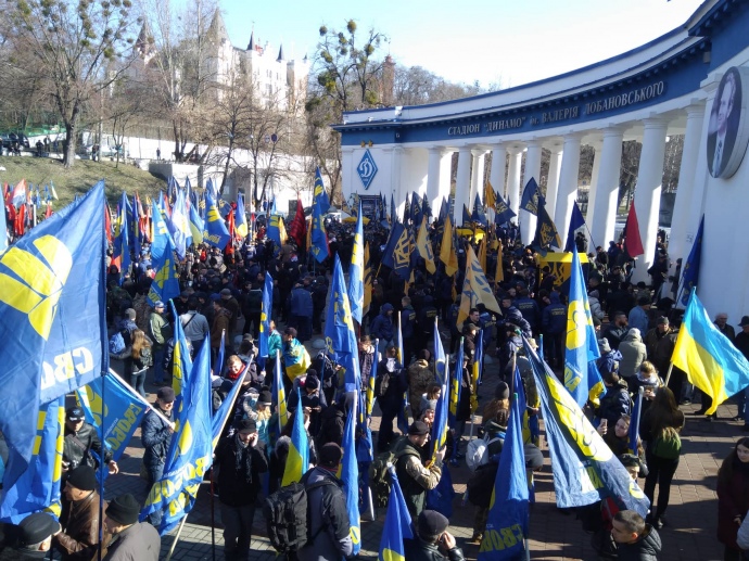 Представители националистических организаций собираются в центре Киева, напротив стадиона Лобановского, чтобы затем отправиться колонной к Кабинету министров, Верховной Раде и Администрации президента.