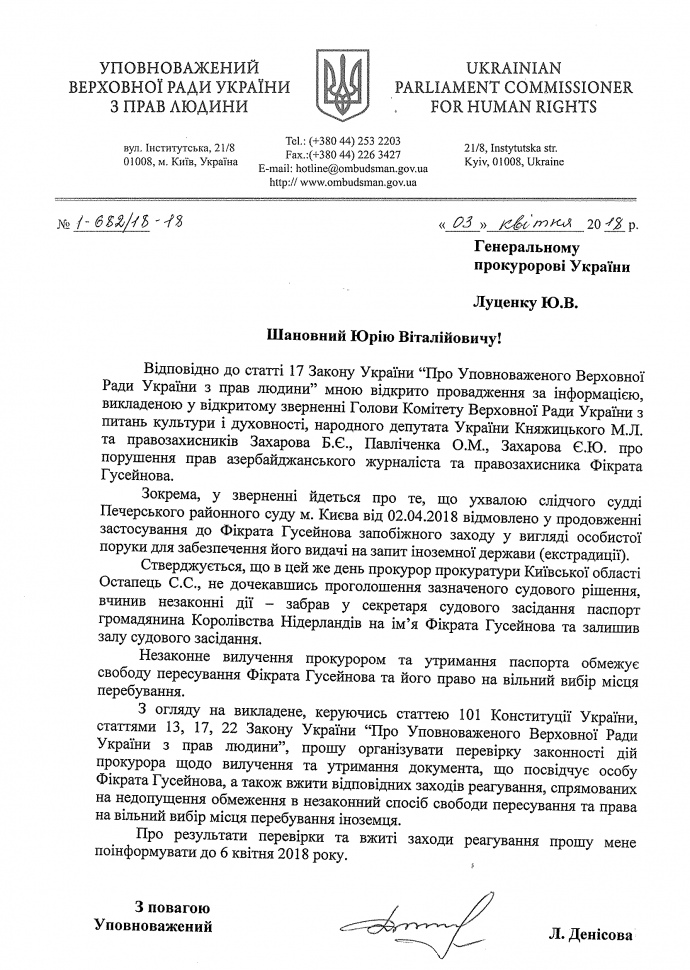 Денисова обратилась к генпрокурору: "Прошу организовать проверку законности действий прокурора по изъятию и удержанию документа, удостоверяющего личность Фикрата Гусейнова, а также принять соответствующие меры реагирования".