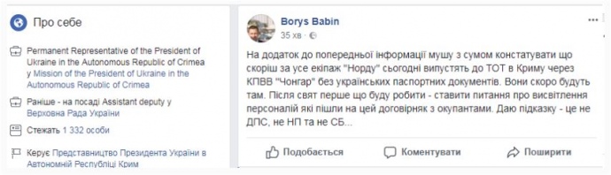 "В дополнение к предыдущей информации должен с грустью констатировать, что скорее всего экипаж "Норда" сегодня выпустят в ВОТ Крыма из КПВВ "Чонгар" без украинских паспортных документов. Они скоро будут там. После праздников первое, что буду делать - ставить вопрос об освещении персоналий, которые пошли на этот договорняк с оккупантами. Даю подсказку - это не ДПС, не НП, не СБ...", - написал Бабин.