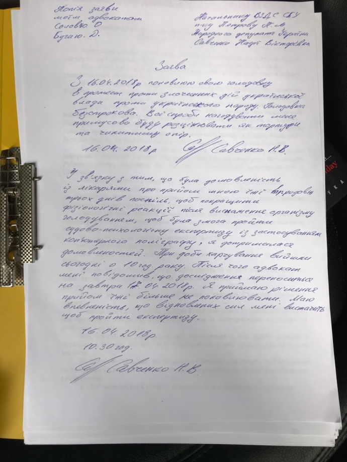 После того Савченко согласилась поесть, чтобы иметь возможность пройти полиграф.