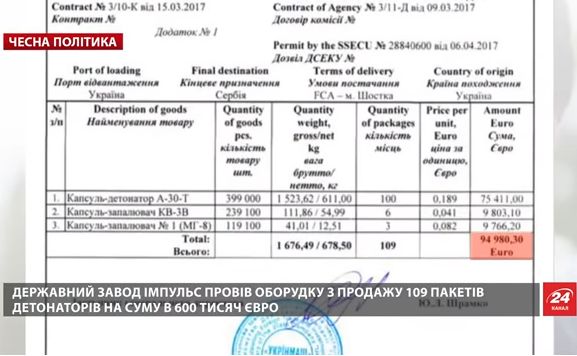 По его словам, государственный завод "Импульс" (Шостка), курируемый Гладковским, год назад продал киевскому оффшору "PH Strategic Business Limited" 109 пакетов детонаторов по заниженной цене – 95 тысяч евро за всю партию. А сербская компания "Слободан" приобрела эту продукцию у оффшора за 700 тысяч евро.