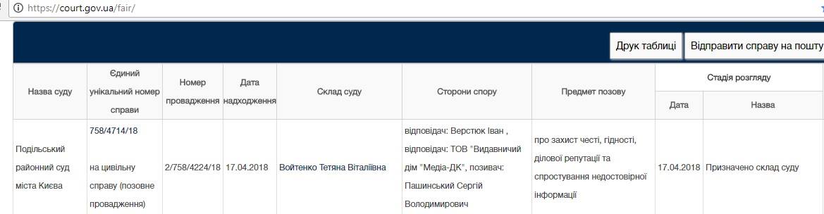 Председатель комитета по нацбезопасности и обороне Сергей Пашинский подал иск о защите чести, достоинства и опровержении недостоверной информации против ООО "Издательский дом Медиа-ДК", который издает журнал "Новое время".