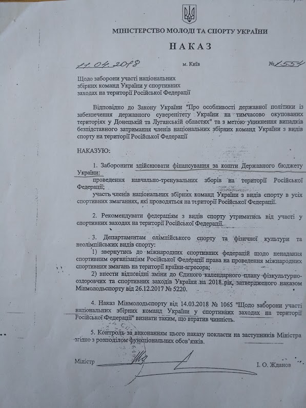 АСБУ также опубликовало приказ Минмолодежспорта от 11 апреля 2018 года, которым предыдущий приказ о запрете участия украинских спортсменов в мероприятиях, проводимых на территории Российской Федерации от 14 марта, признается утратившим силу.