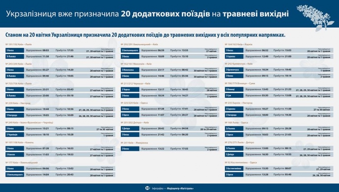 "Укрзализныця" назначила 20 дополнительных поездов на майские праздники в популярных направлениях.