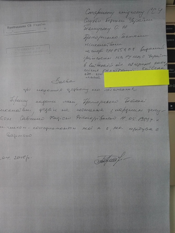 Помощник депутата выложила образец заявления, а также текст своего ходатайства о встрече с Савченко.
