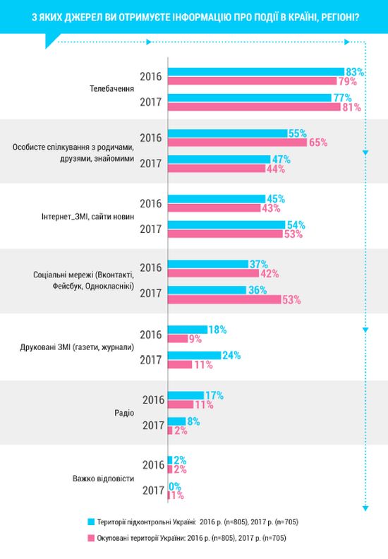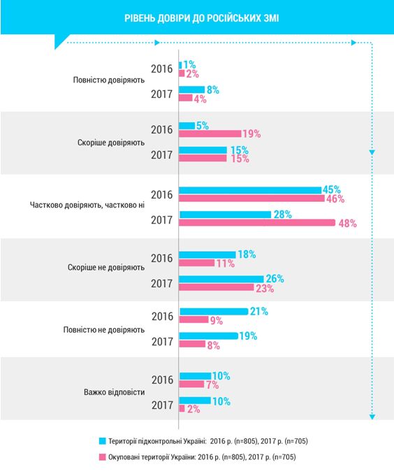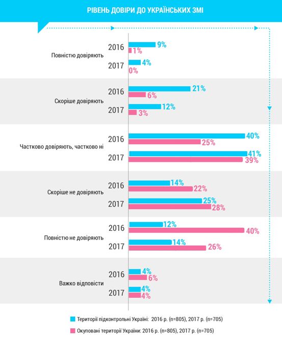 "На оккупированных территориях можно сказать, что уменьшился уровень радикально негативного отношения к украинским СМИ. В частности, уменьшилось количество тех, кто полностью не доверяет украинским СМИ – 26% (40% в 2016 году). В то же время, выросла доля тех, кто в чем-то доверяет, а в чем нет – 39% (25% в 2016 году)", – говорится в отчете социологов.