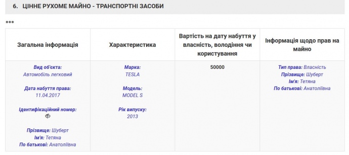 Также, согласно выписке из Реестра прав на недвижимое имущество, сын Татьяны Шуберт Владимир владеет тремя квартирами в микрорайоне Позняки. Кроме того, в прошлом году, после того как подарил Tesla матери, он приобрел себе новенький Ford Mondeo стоимостью около 30 тысяч долларов.