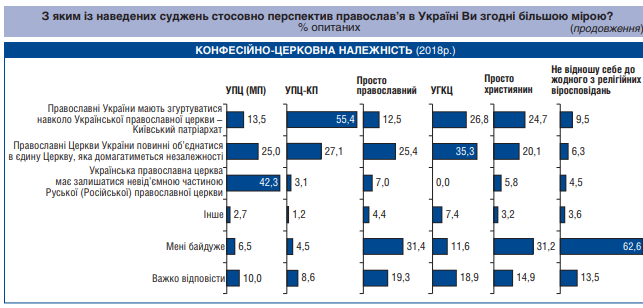 Отмечается, что среди опрошенных, которые являются прихожанами УПЦ МП, 42,3% выступают за то, чтобы Украинская православная церковь оставалась неотъемлемой частью РПЦ, 25% выступают за объединение православных церквей Украины в единую церковь, которая будет добиваться независимости и только 13,5% считают, что необходимо сплотиться вокруг УПЦ КП.