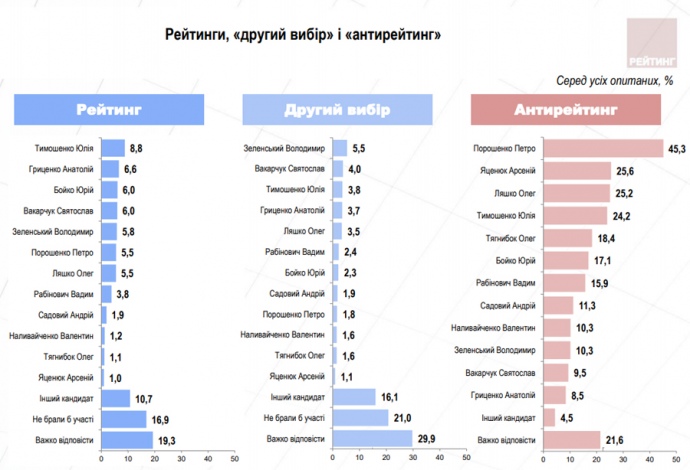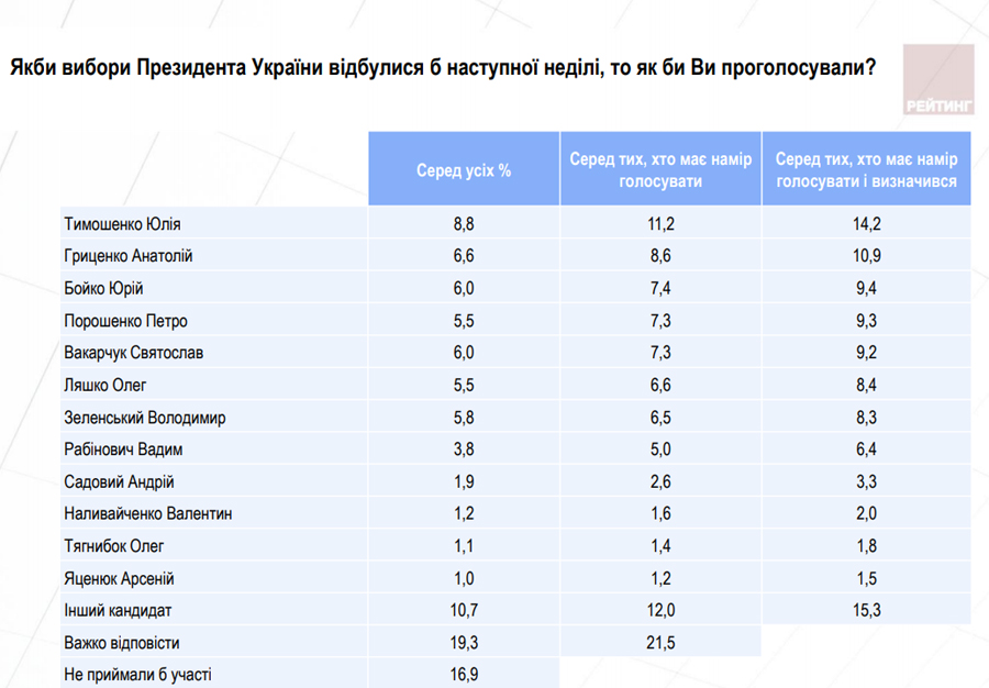 В президентском рейтинге лидирует руководительница партии "Батькивщина" Юлия Тимошенко, имея при этом поддержку на уровне 8,8% среди всех опрошенных респондентов.