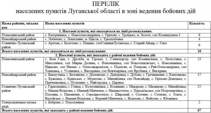Волонтер Роман Доник опубликовал в Facebook перечень населенных пунктов Донецкой и Луганской областей, входящих в зону боевых действий в соответствии с новыми правилами в связи с началом проведения Операции объединенных сил.