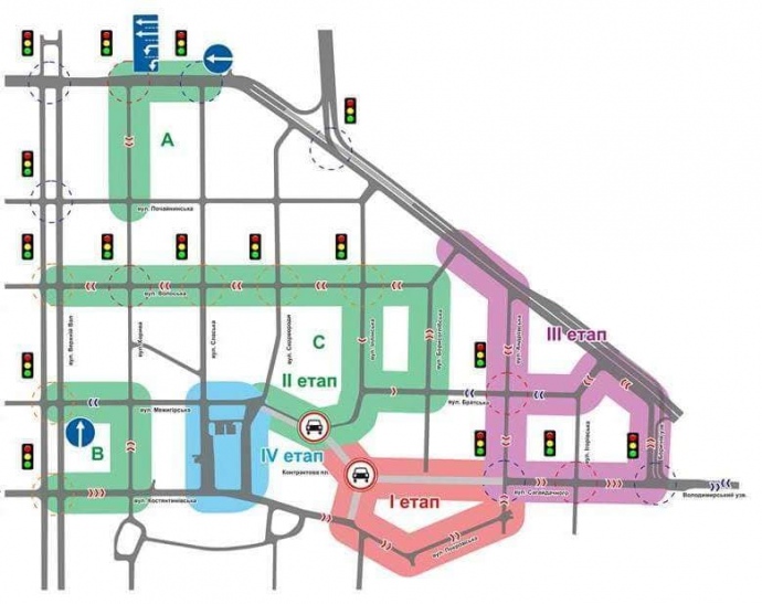 Левый поворот с улицы Верхний Вал на улицу Межигорскую будет происходить через улицы Константиновскую и Хорива, чтобы сократить длину пробок на улицах Верхний Вал и Глыбочицкой в вечерние часы пик.