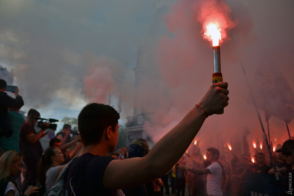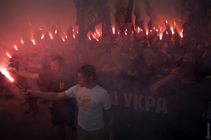 "По дороге они скандировали "Москалей на ножи", "Пам'ятай, чужинець, тут господар українець", "Героям другого мая слава", "Слава нации – смерть врагам" и "Украина понад усе", – говорится в репортаже.