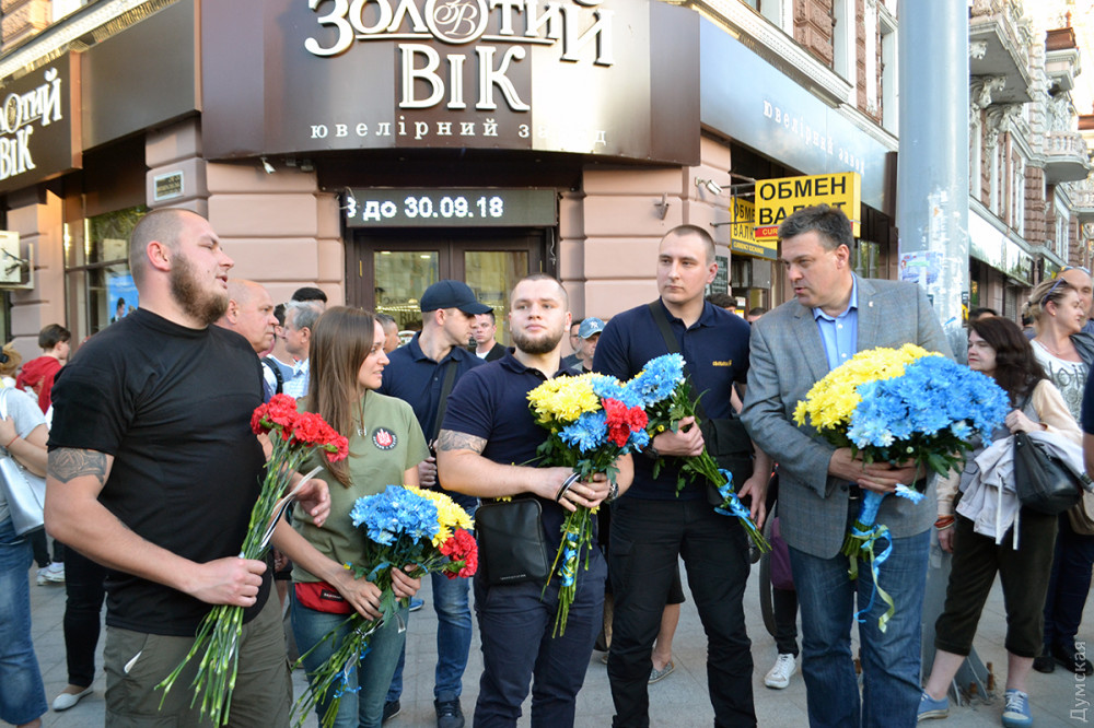 Он принес "погибшим защитникам Одессы" цветы цвета украинского флага.