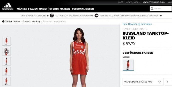 Ранее сообщалось, что компания Adidas создала к Чемпионату мира по футболу в России женское платье, которое является частью целой серии, на котором демонстрируется герб Советского Союза и надпись на английском "СССР".