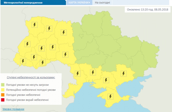В течение суток 9 мая в ряде областей Украины ожидаются грозы, местами шквалы 15-20 м/с.