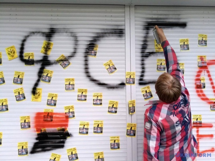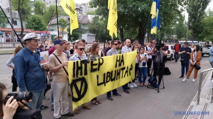Активисты ОО "Вільні люди" пикетируют офис "Национальных информационных систем" с требованием отменить концерт "Победа. Одна на всех", которая должна начаться в 20:30 на телеканале "Интер".