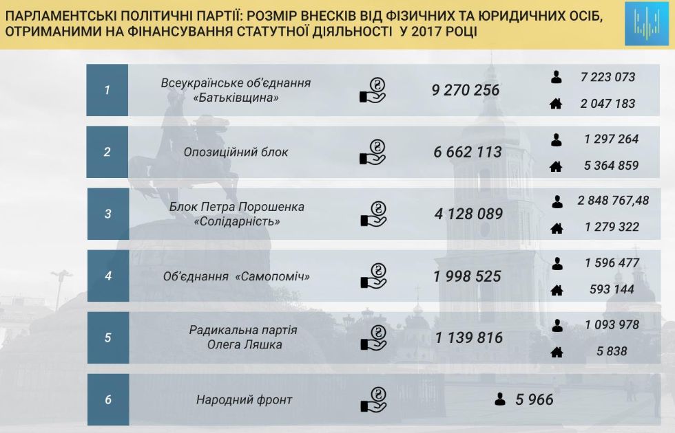 Всеукраинское объединение "Батькивщина" зафиксировало больше других партий взносов за 2017 год – более 9,27 миллиона гривен.