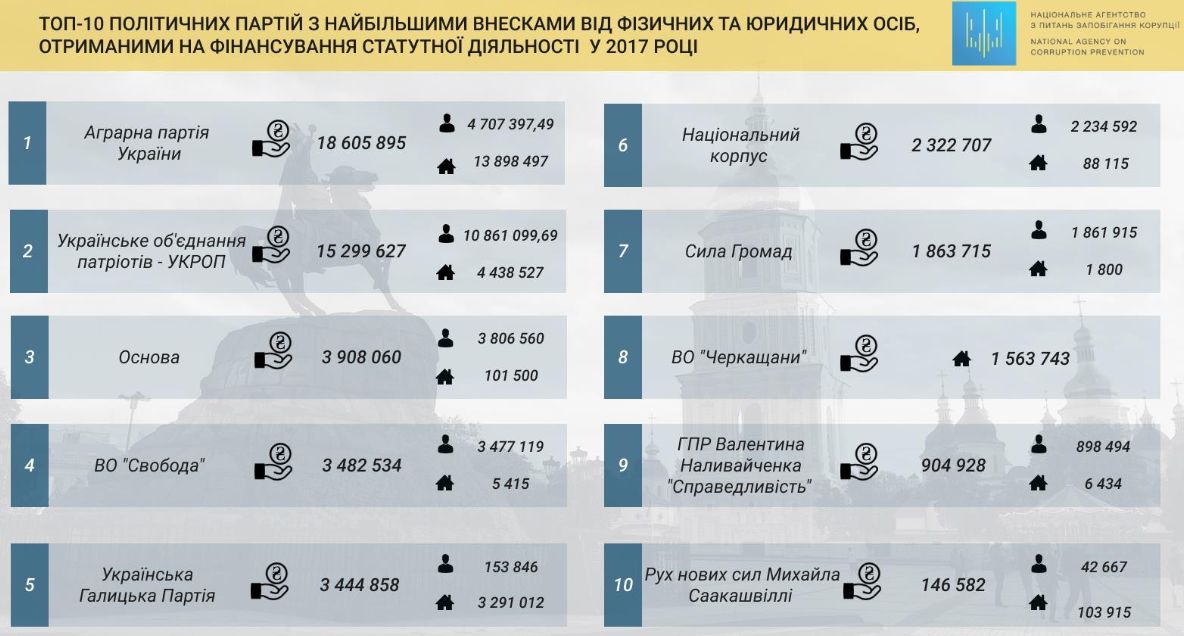 Из них около 7,2 миллиона гривен – это взносы от физических лиц, еще 2 миллиона гривен – пожертвования от юридических лиц, сообщает Национальное агентство по предотвращению коррупции.