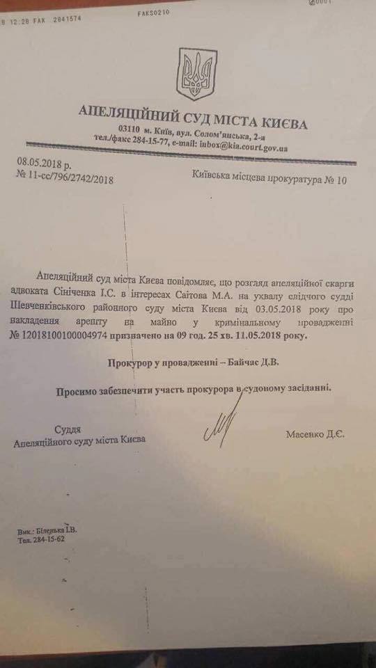 "Рассмотрение апелляционной жалобы адвоката Синиченко И.С в интересах Саитова М.А. на постановление следственного судьи Шевченковского районного суда Киева от 03.05.2018 года о наложении ареста на имущество в уголовном производстве №12018100100004974", - говорится в документе.