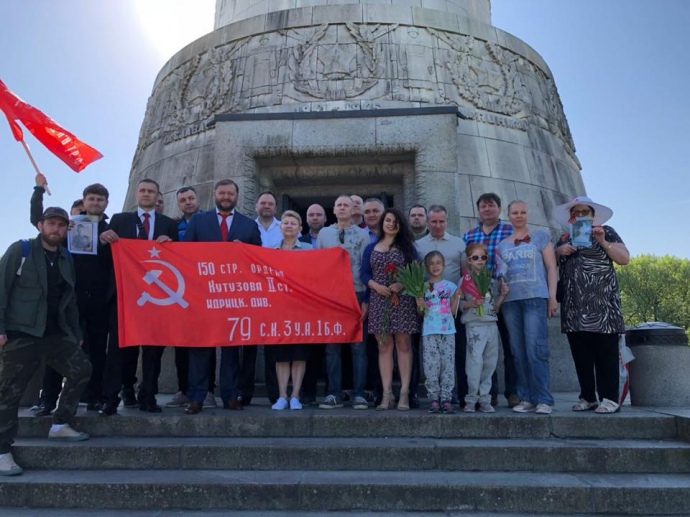 Народный депутат от "Оппозиционного блока" Михаил Добкин возложил цветы к памятнику Неизвестному солдату в Берлине и сфотографировался со "знаменем победы".