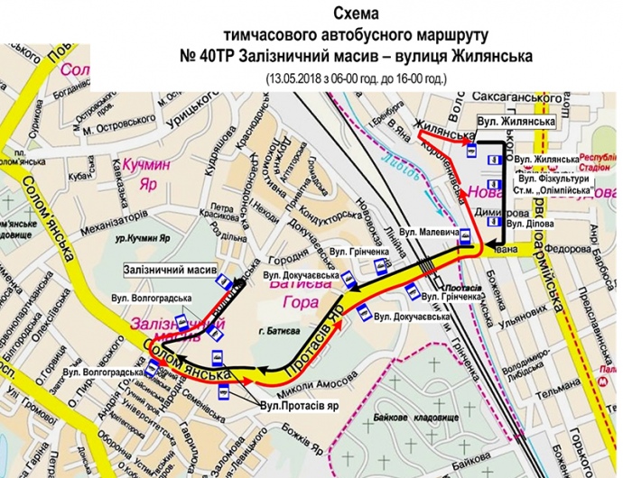 Дополнительно от начала движения ориентировочно до 16:00 для обеспечения пассажирских перевозок организуется движение автобусов № 40ТР "Железнодорожный массив - улица Жилянская" по маршруту: