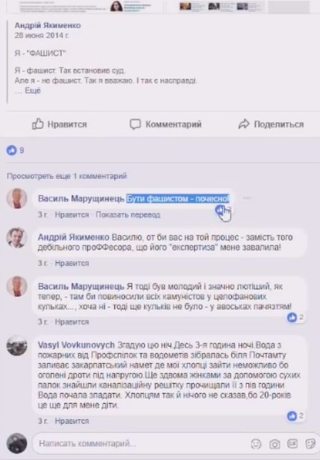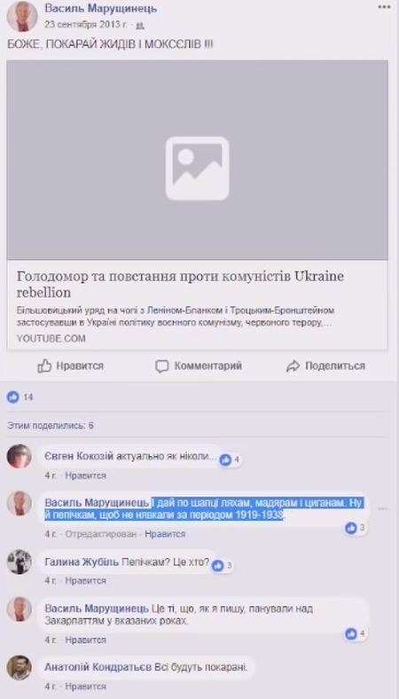 Однако 12 мая скандально известный блогер Анатолий Шарий выложил в видеоподборке скриншоты сообщений за разные годы с Fb-страницы якобы консула. Он отметил, что у Марущинца две страницы, так как его периодически блокируют.