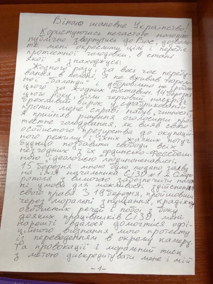 Сам Балух написал письмо украинцам, в котором рассказал, почему решил начать голодовку, а также о том, как ему приходится терпеть физические и моральные издевательства со стороны сотрудников крымского СИЗО.
