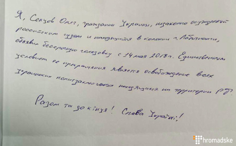 "Я, Сенцов Олег, гражданин Украины, незаконно осужден российским судом и находящийся в колонии города Лабытнанги, объявил бессрочную голодовку с 14 мая 2018 года. Единственным условием ее прекращения является освобождение всех украинских политзаключенных, которые находятся на территории РФ. Вместе и до конца! слава Украине", - написал Сенцов.