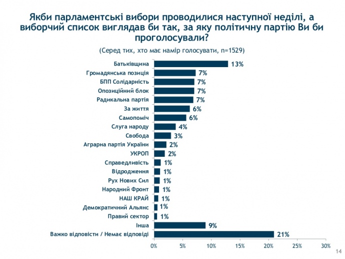 Так, на вопрос, если бы выборы проходили бы в следующее воскресенье, а избирательный список выглядел бы так, то за какую политическую партию вы бы проголосовали, 13% респондентов, которые намерены участвовать в выборах, ответили, что поддержали бы партию "Батькивщина".