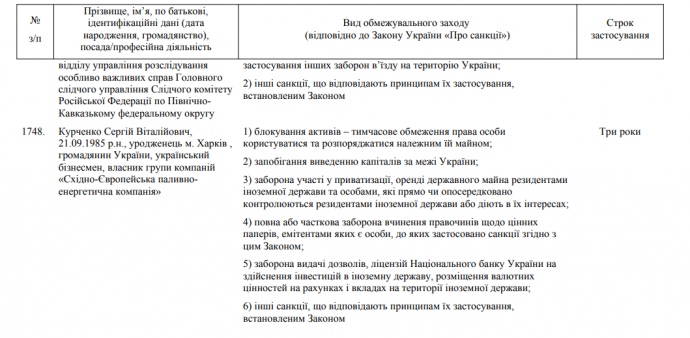 В приложении к решению СНБО сообщается, что в списке физических лиц, в отношении которых применяются ограничительные меры (санкции), указан и бизнесмен, владелец группы компаний "Восточно-Европейская топливно-энергетическая компания" Сергей Курченко.
