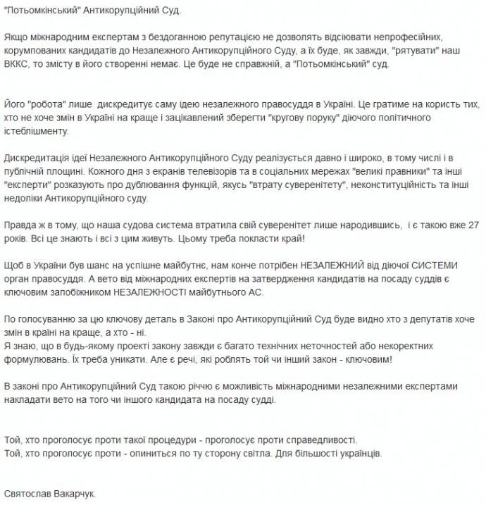 "Если международным экспертам с безупречной репутацией не позволят отсеивать непрофессиональных, коррумпированных кандидатов в независимый антикоррупционный суд, а их будет, как всегда, "спасать" наш ВККС (Высшая квалификационная комиссия – ред.), то смысла в его создании нет", – считает Вакарчук.
