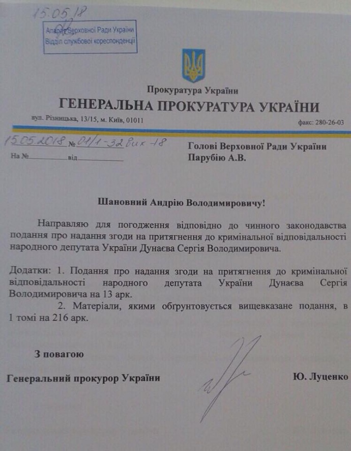 15 мая ГПУ передала в ВР представление на депутата "Оппозиционного блока" Дунаева, которого подозревает в декларировании недостоверной информации.